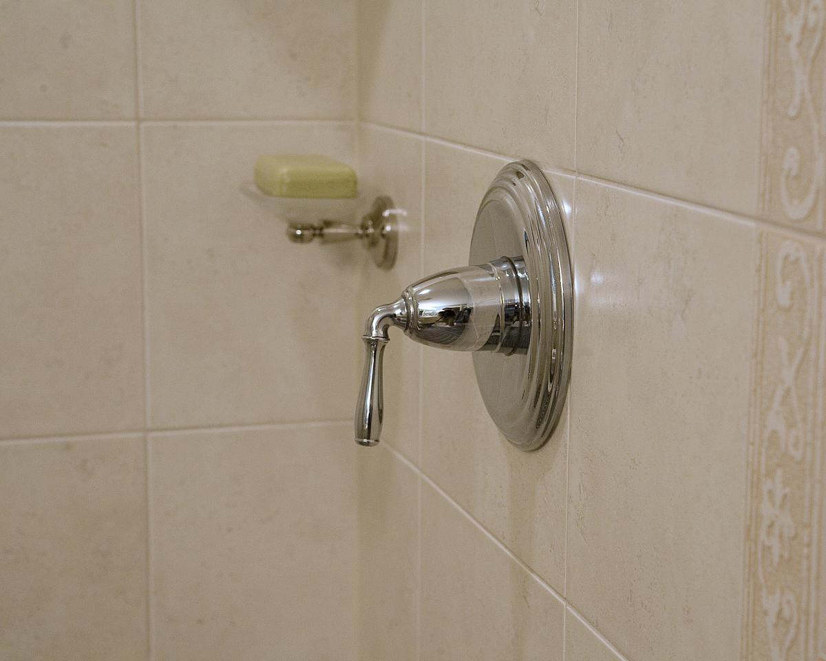 This was a typical 5’x 9’ hall bath with a fragile 3/16” glass shower door.